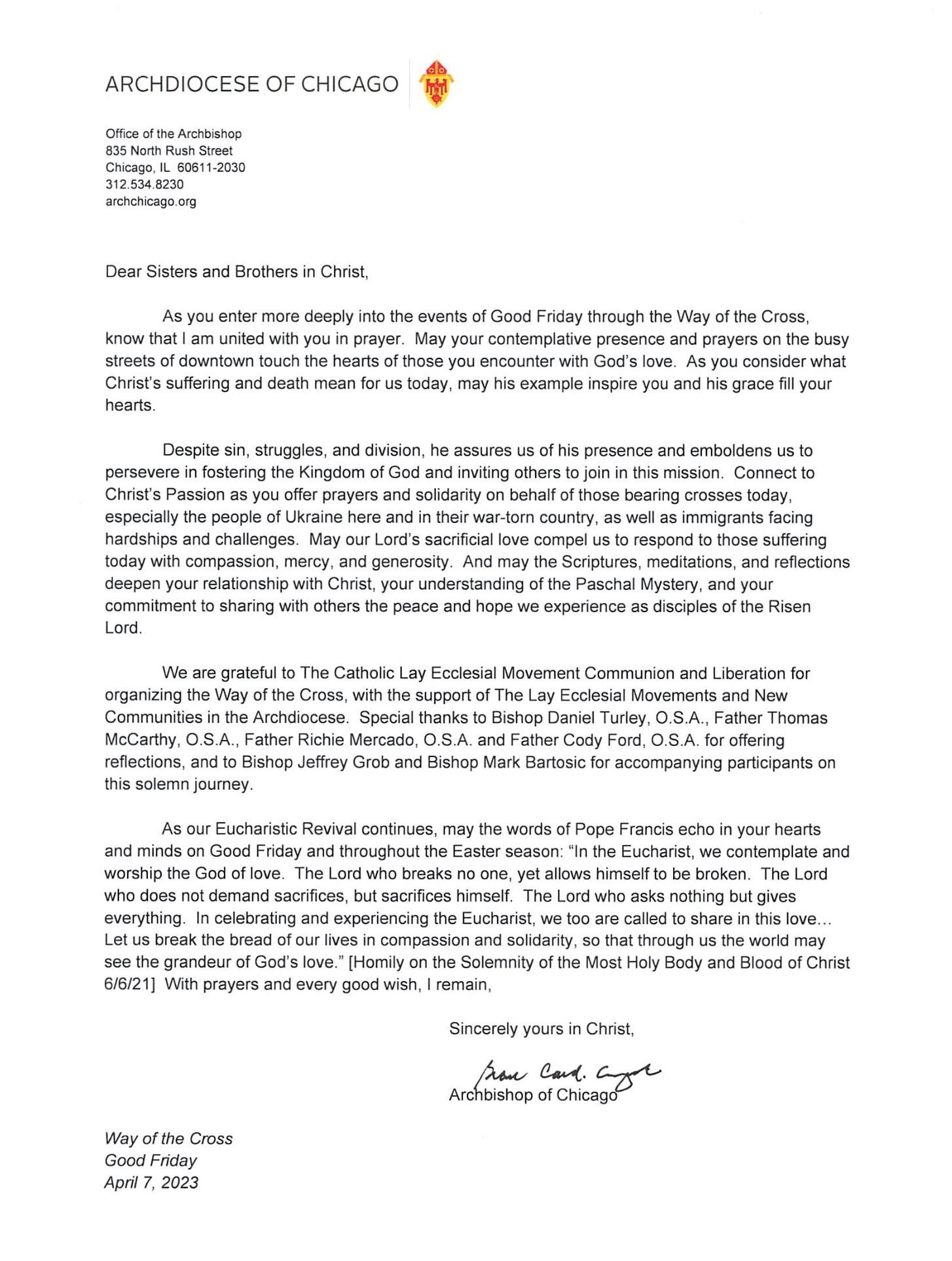 As you remember and contemplate what Christ’s suffering and death means for us, your prayerful procession in the heart of the city is a powerful witness of our synodal church walking together with faith and hope in Christ and with love and concern for our sisters and brothers, especially those who are suffering. I join my prayers to yours for peace in the world, especially in the Holy Land, in Ukraine and for migrants throughout the world.